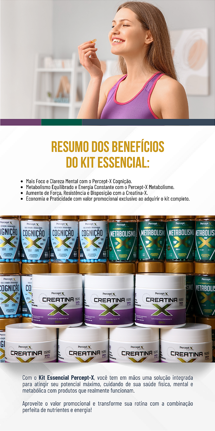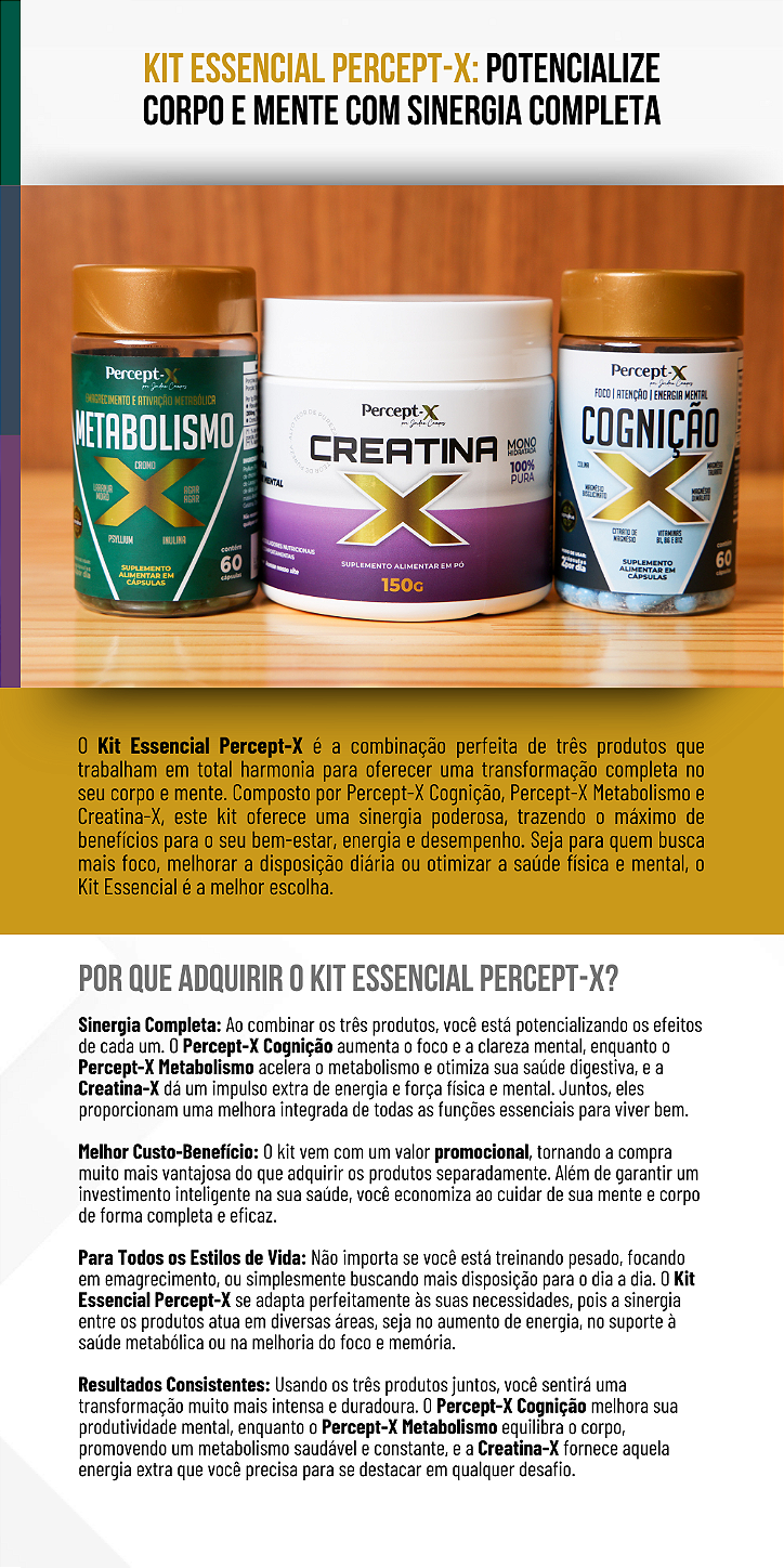 Mais Foco e Clareza Mental com o Percept-X Cognição. Metabolismo Equilibrado e Energia Constante com o Percept-X Metabolismo. Aumento de Força, Resistência e Disposição com a Creatina-X. Economia e Praticidade com valor promocional exclusivo ao adquirir o kit completo. Com o Kit Essencial Percept-X, você tem em mãos uma solução integrada para atingir seu potencial máximo, cuidando de sua saúde física, mental e metabólica com produtos que realmente funcionam. Aproveite o valor promocional e transforme sua rotina com a combinação perfeita de nutrientes e energia!